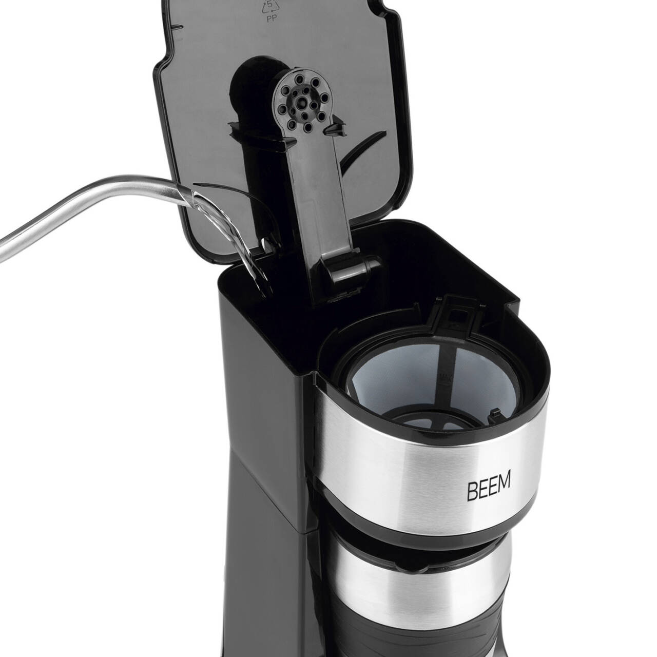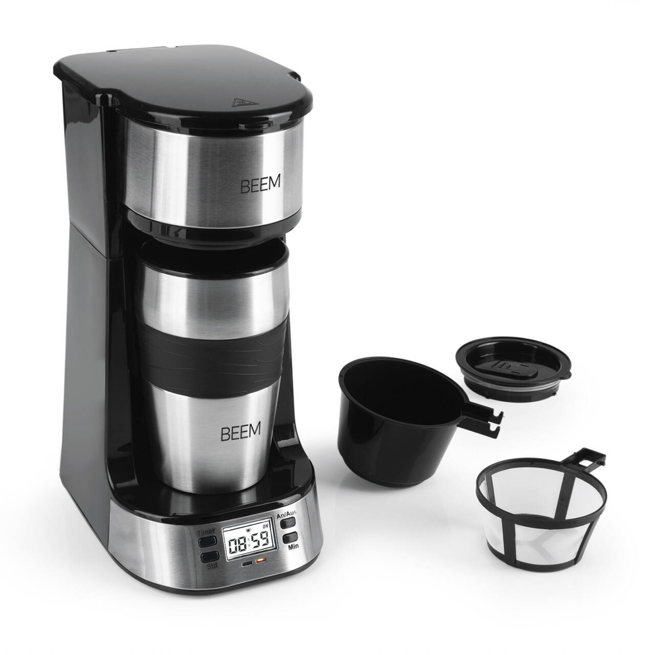 Eine kleine und kompakte Kaffeemaschine mit einem hochwertigen To-Go Kaffeebecher für einen Kaffee. Die Kaffeemaschine hat zudem einen 24 Stunden Timer zum programmieren – Kaffeegenuss zur Wunschzeit! Thermo 2 Go ist eine Filterkaffeemaschine für Kaffeepulver bzw. gemahlene Bohnen, mit einem permanenten Filter, welcher einfach und leicht gereinigt werden kann und Papierfilter ersetzt.