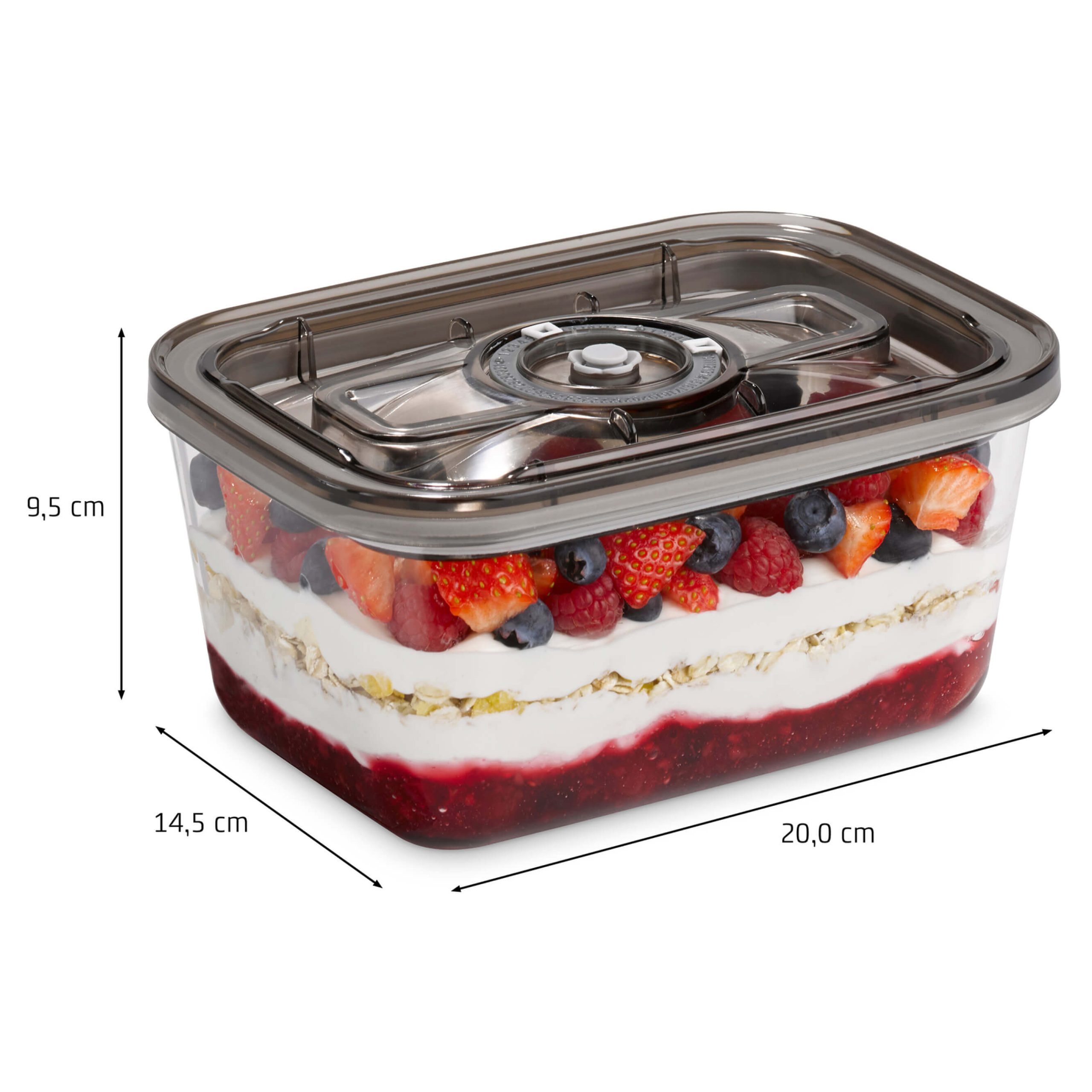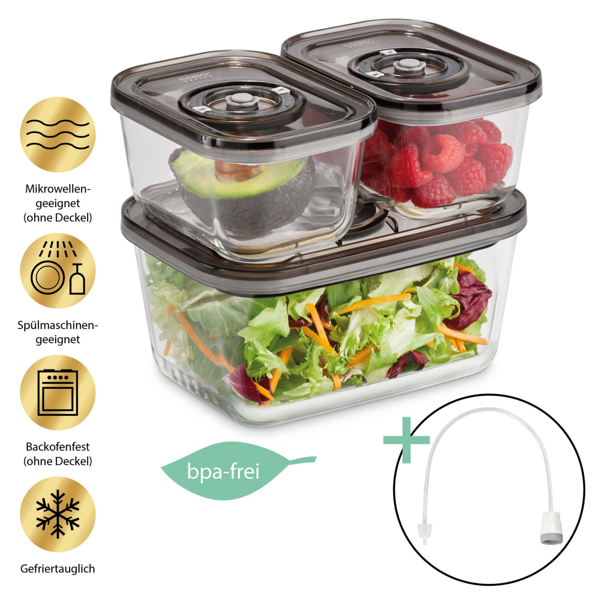 - Set bestehend aus: 1 Behälter mit 1500 ml Fassungsvermögen, 2 Behältern mit je 500 ml Fassungsvermögen, 1 Vakuumierschlauch mit Adapter