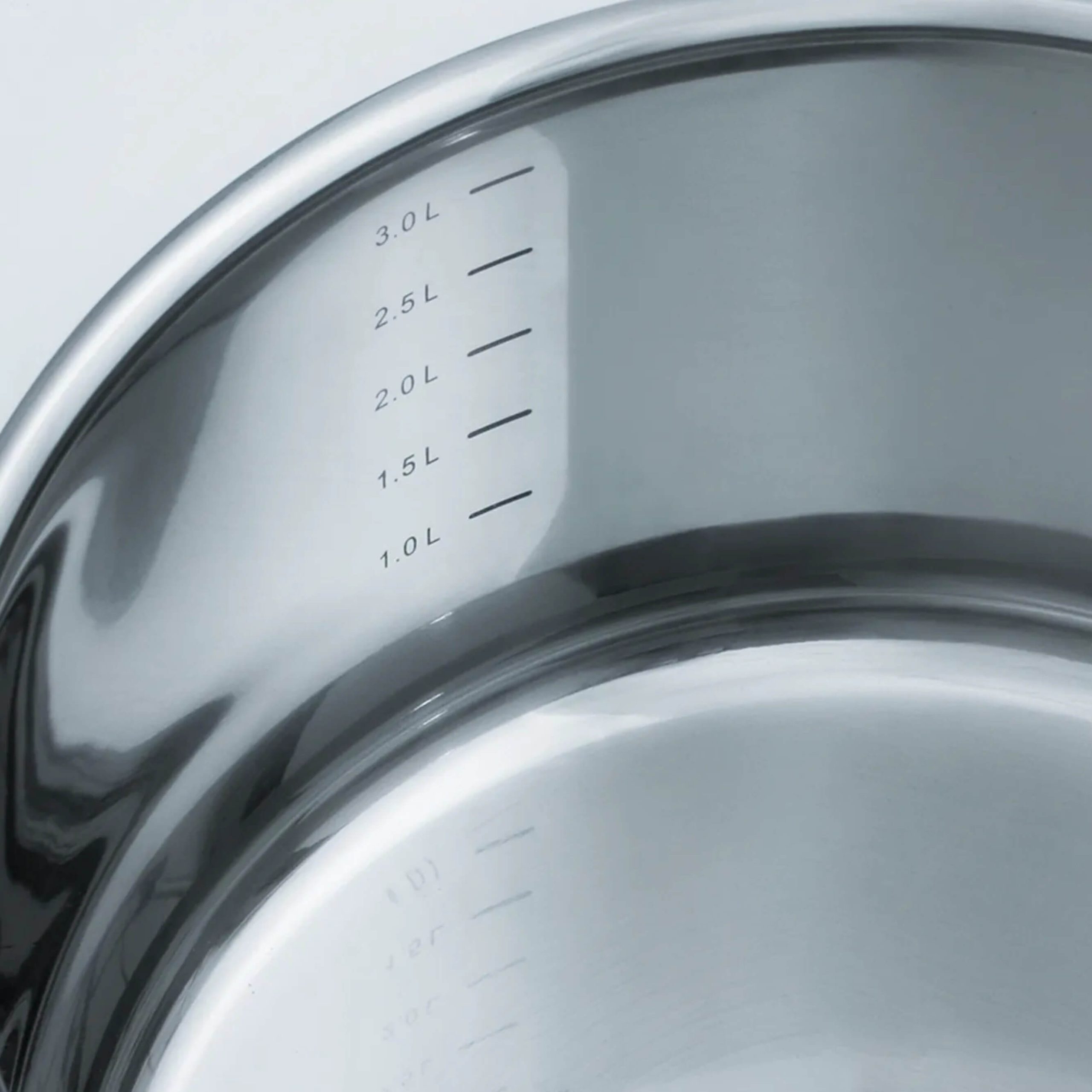 Hochwertiger Edelstahl rostfrei 18/8 mit handfreundlichen Kaltmetallgriffe, außen seidenmatt, innen hochglanzpoliert. Zudem innen mit praktischer Literskala. Energiesparender und extra starker Thermo-Kapselboden.
