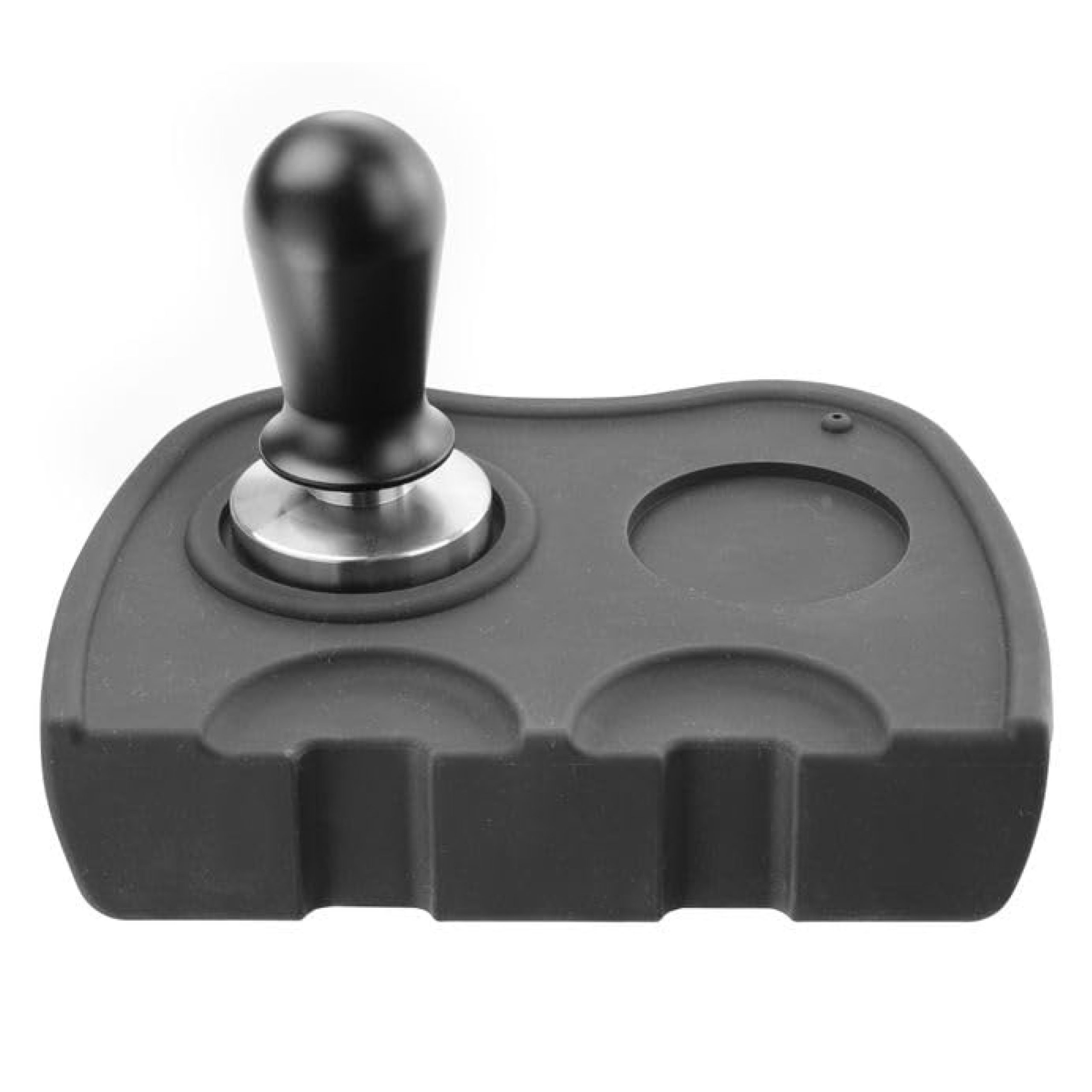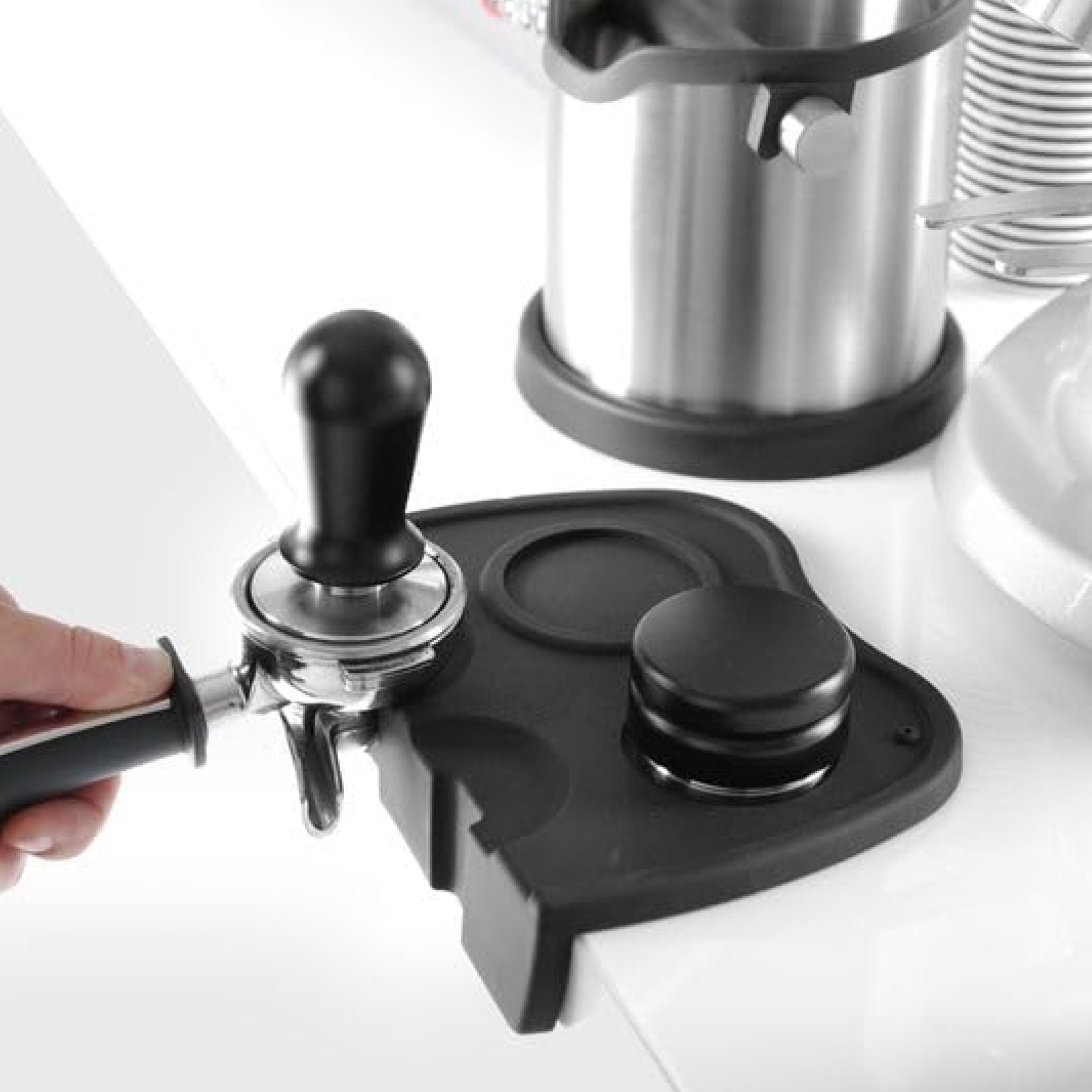 Die Unterlage überzeugt durch ihre clevere Aussparung, in der Sie bequem zwei Siebträger während des Tampvorgangs platzieren können – ein echtes Plus für professionelle Baristas und ambitionierte Kaffeeliebhaber. Zwei integrierte Halterungen bieten zusätzlichen Komfort, indem sie den Tamper sicher verwahren und somit Ordnung am Arbeitsplatz schaffen.