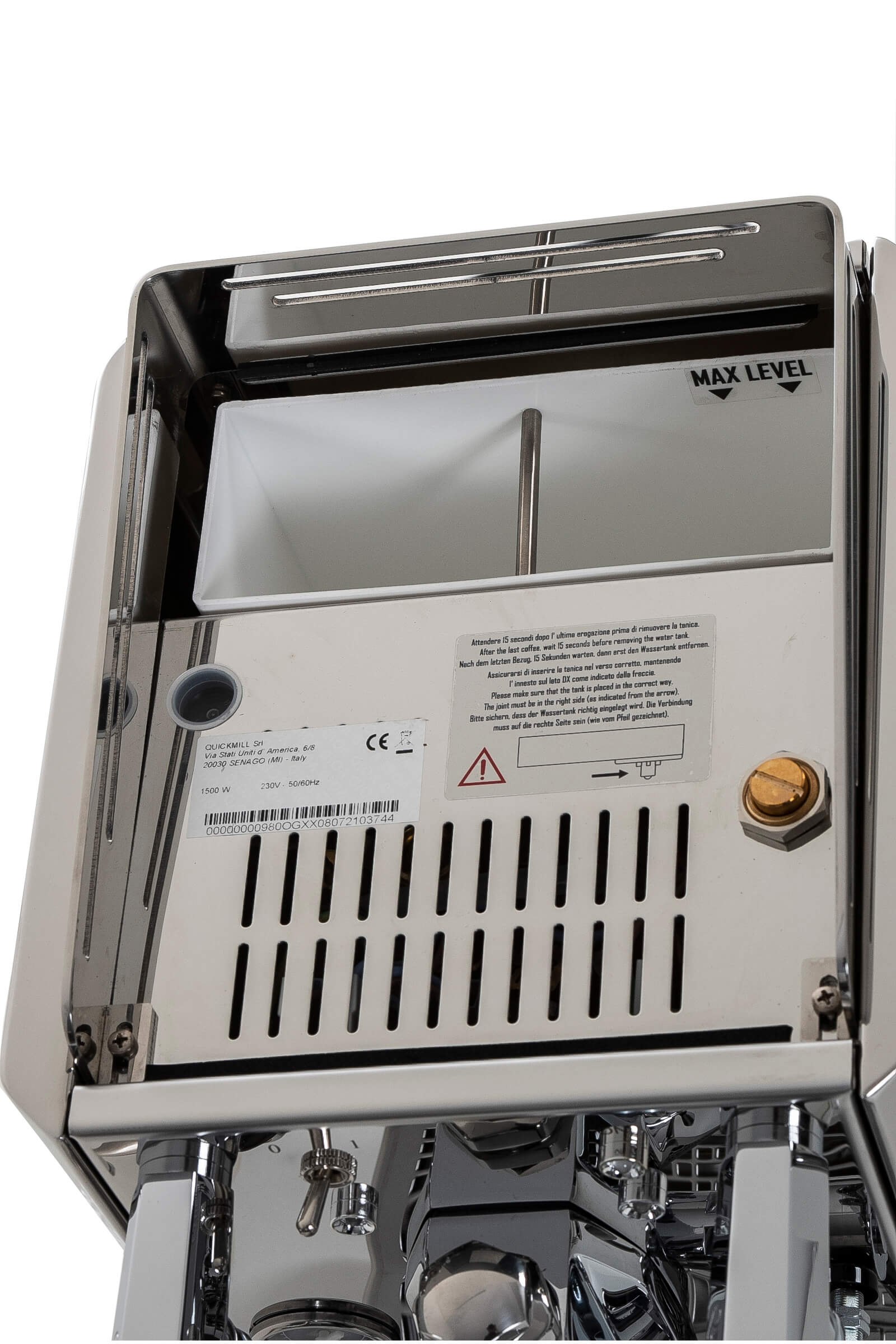 Zum Brühen eines Espresso braucht es, neben der Espressomaschine, einen mit einer Kaffeemühle gemahlenen Kaffee und Wasser. Die Espressomaschine von QuickMill hat einen Wassertank mit einem Fassungsvermögen von 3 Liter und einen separaten Wasseranschluss. Je nach Belieben können sie ihre Wasserzufuhr selbst wählen. Die Maschine hat eine automatische Befüllung des Boilers und zieht sich das Wasser aus z.B. dem Wassertank. Ist in diesem nicht genügend Wasser vorhanden, schaltet sich die Siebträgermaschine und die Vibrationspumpe zum Schutz der Espressomaschine automatisch aus.